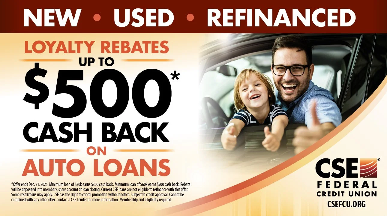 This offer ends December 31, 2025. Minimum loan of $30,000 earns $300 cash back. Minimum loan of $60,000 earns $500 cash back. Rebate will be deposited into member’s share account at loan closing. Current CSE loans are not eligible to refinance with this offer. Some restrictions may apply. CSE has the right to cancel promotion without notice. Subject to credit approval. Cannot be combined with any other offer. Contact a CSE Lender for more information. Membership and Eligibility required.